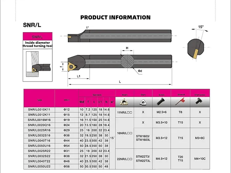 - SNR: Indica que es un portaherramientas para roscado interno (la “R” a veces se asocia con “Right-hand” o diestro, lo cual es común para este tipo de herramientas).